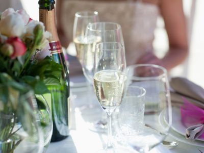 Later that evening, depending on where the rehearsal dinner is held, there might not be a wine list commensurate with either the solemnity of the occasion or your love of the sparkly stuff. The good news is that you can often bring your own wine; the bad news is that, depending on the restaurant or venue, they might charge a corkage fee, which is a surcharge for them to open each bottle of wine. (It might be considerable; check in advance.) If you’re going to bring your own sparkling wine, plan for each bottle to fill five glasses, and for each person to have two servings. Multiply times the number of people attending the dinner, and you know how many bottles to buy.