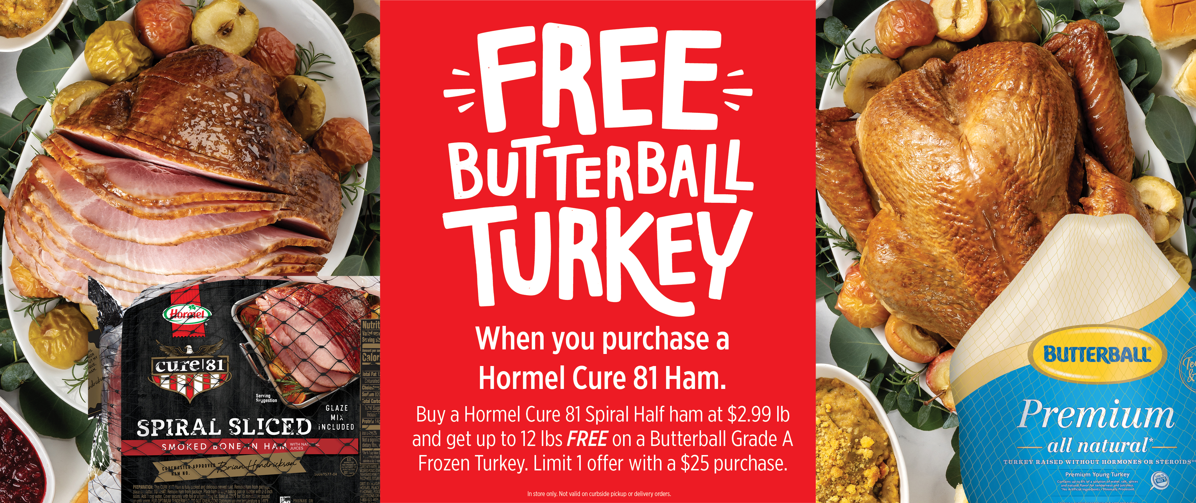 Purchase a Hormel Cure 81 ham at $2.99 lb and get up to 12 lbs free on a Butterball Grade A Frozen Turkey. Limit 1 per customer with a $25 in-store purchase. Not valid on curbside pickup & delivery orders.